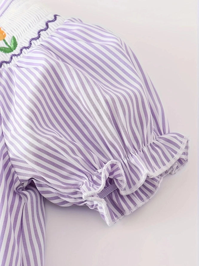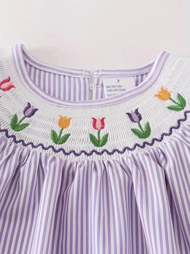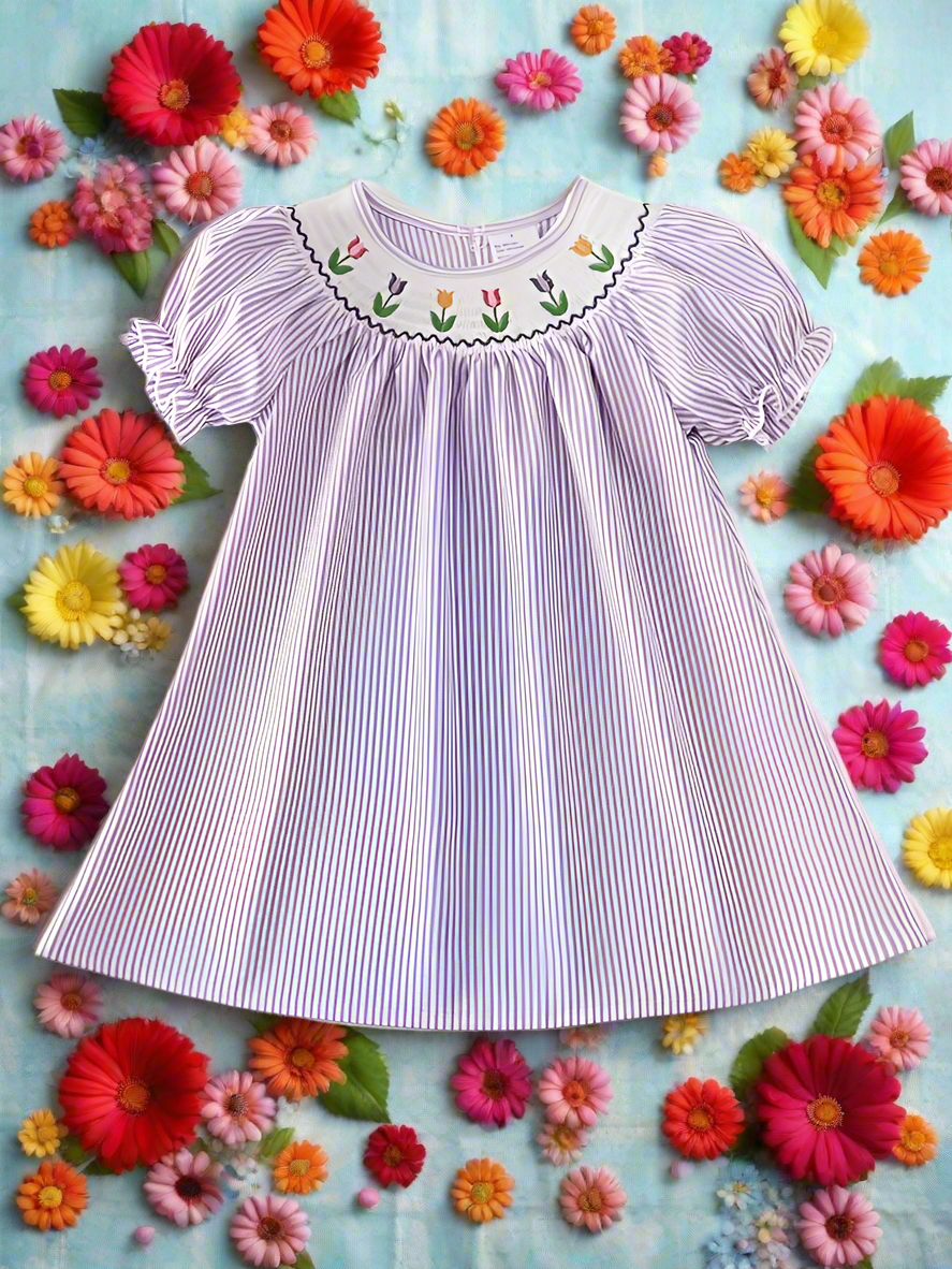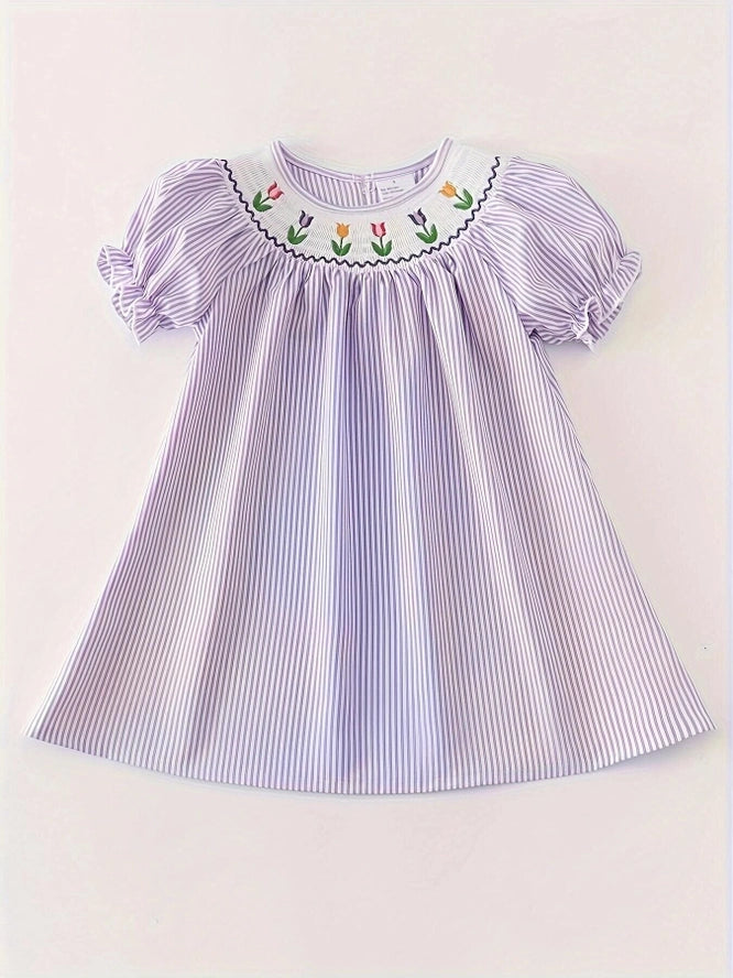 Make your little one stand out in style with our Girls Flower Embroidered Dress! This charming dress features a playful striped pattern and delicate embroidery, perfect for any occasion. With its short sleeves and comfortable fit, your little girl will look and feel special.