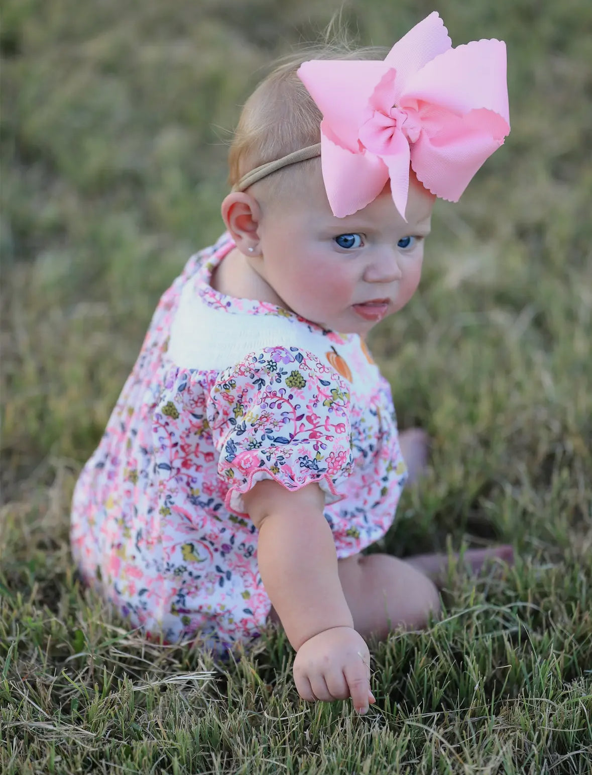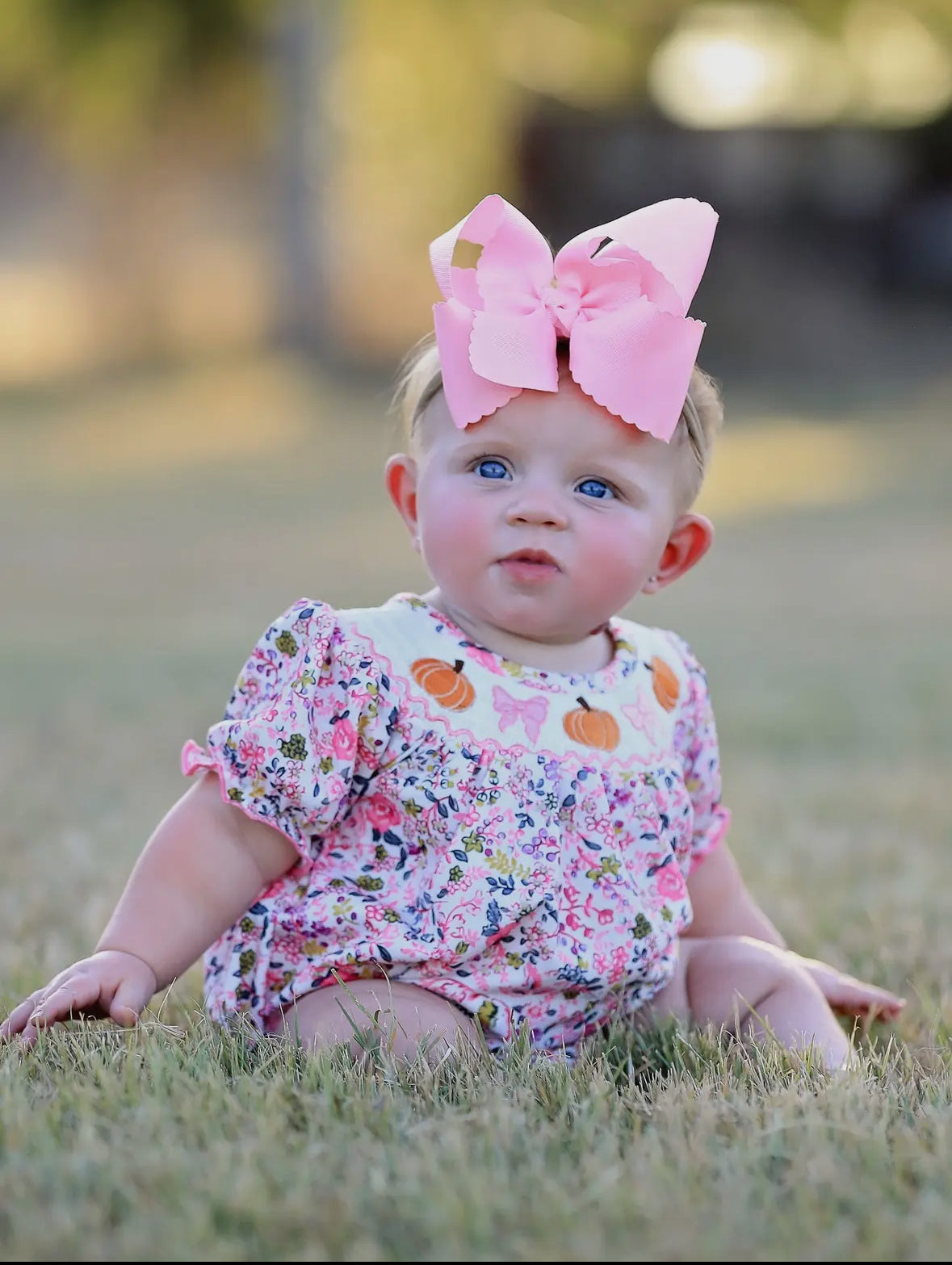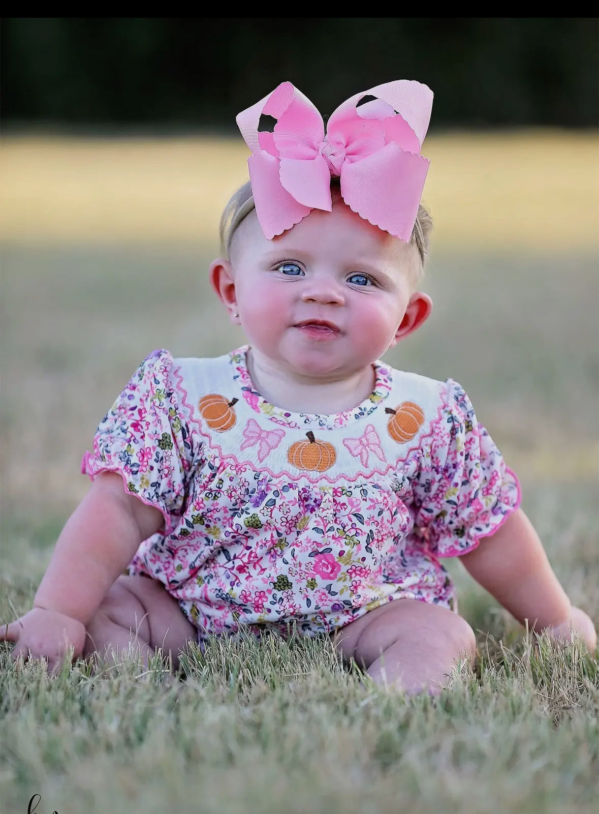 Dress your little girl in this adorable pumpkin romper! The intricate smocking and embroidered details will make her standout in any holiday photo. Made with soft and durable fabric for all day comfort. Perfect for partiesor any festive event.